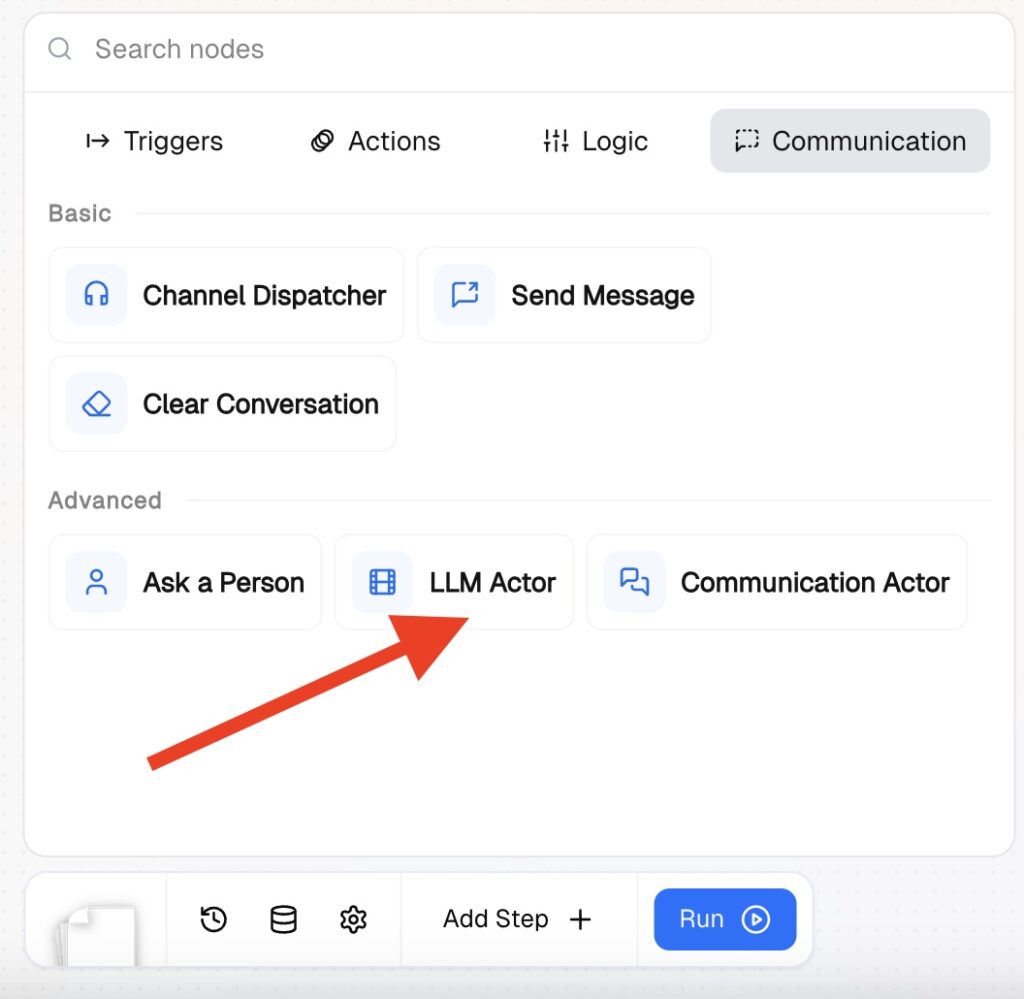 The LLM Actor node handles conversations using a large language model with tool calling. Unlike the Communication Actor — which uses the Skillset Engine — the LLM Actor gives you direct control over the model, system prompt, and available tools.