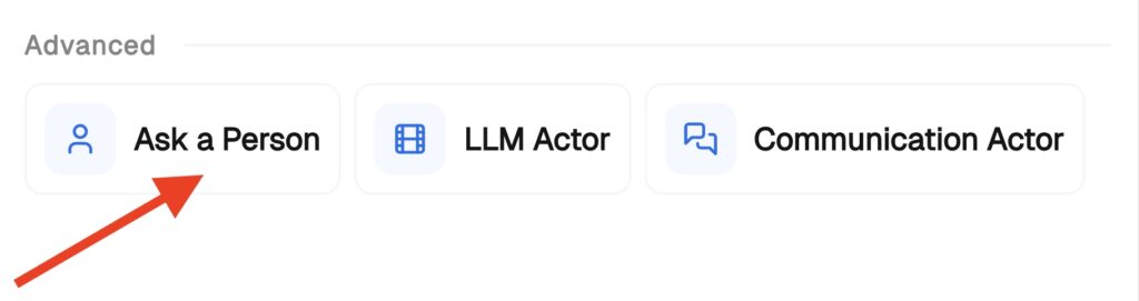 The Ask a Person node combines a communication channel and an AI skillset in a single step. It opens the channel, assigns a skillset to manage the conversation, and handles message routing automatically — no separate routing nodes required.