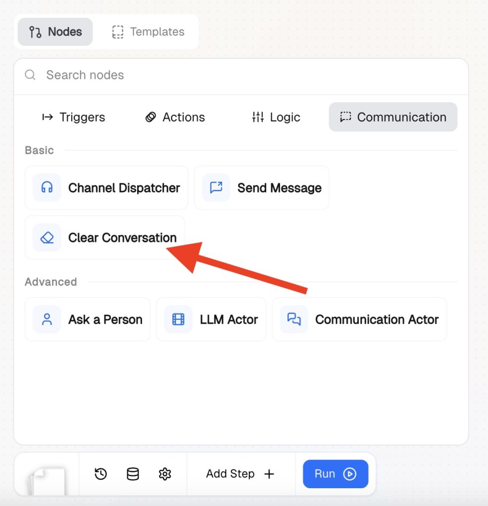 The Clear Conversation node removes data from the active conversation in the current workflow execution. You can selectively clear messages, metadata, state, or any combination of the three.