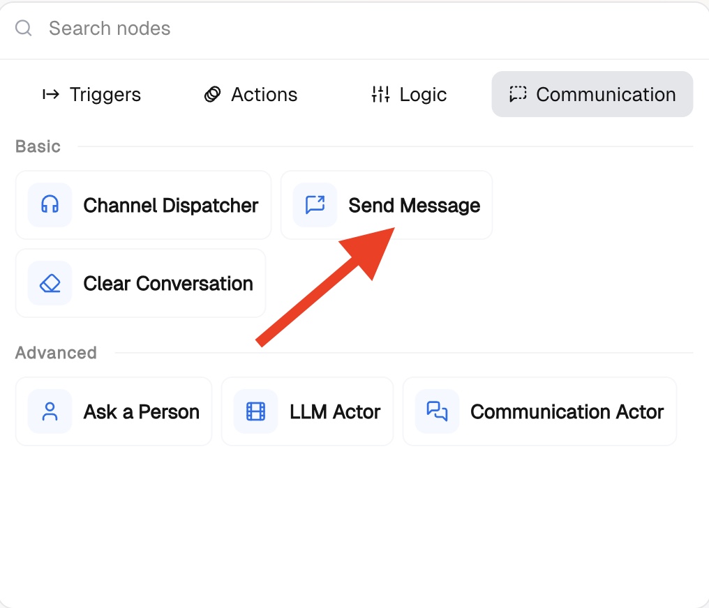 The Send Message node sends a message through an active conversation. It locates the conversation from the current workflow execution and delivers your message through the same channel the person is using — email, Slack, web widget, SMS, or otherwise.