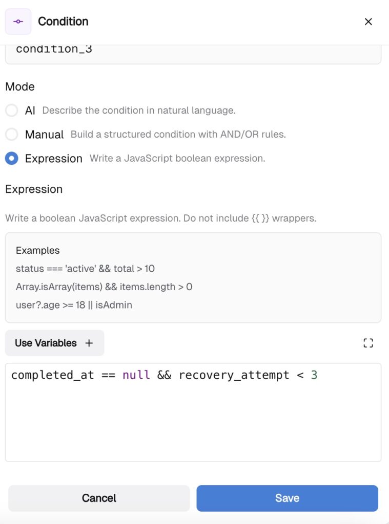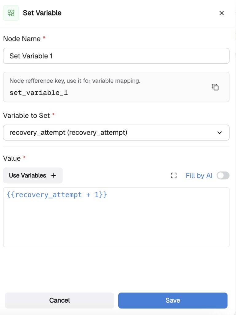 Click “Add Step” and select Set Variable. Select recovery_attempt and set the value to: