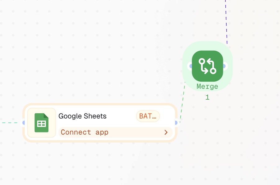 After the Google Sheets branches, add a Merge node to rejoin into a single flow. Name this node “Merge — After Log_in.” The Merge node will unite all of the branches and continue the workflow once the previous nodes have successfully executed.