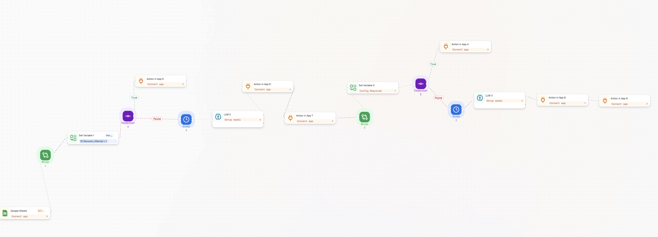 - True Branch → Sleep 24 hours → back to the LLM node to generate the next email with a stronger offer. On attempt 2, include a 10% discount; on attempt 3, include a 15% discount with a 48-hour deadline.
